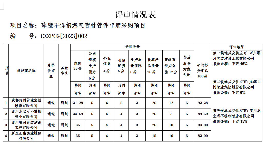 薄壁不銹鋼燃?xì)夤懿墓芗甓炔少忢?xiàng)目按照程序于2023年4月11日10時(shí)00分進(jìn)行了競爭性磋商,采購人通過磋商小組推薦的成交候選供應(yīng)商名單確定了成交供應(yīng)商,現(xiàn)將結(jié)果公示如下: