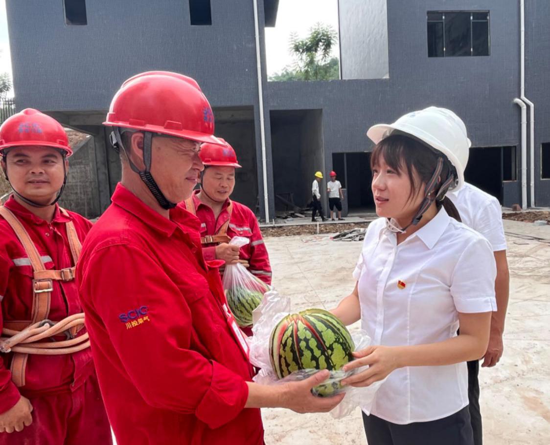 炎炎夏日送清涼,情系一線沁人心。持續(xù)高溫悶熱天氣,給堅守一線的工作人員帶來了嚴峻“烤”驗,也時刻牽動著集團領(lǐng)導(dǎo)的心。2023年7月21日下午,川投燃電集團黨委副書記、職工董事、工會主席包婷婷一行來到榮縣川燃安裝施工現(xiàn)場,開展高溫慰問送清涼活動,為奮戰(zhàn)在高溫一線的勞動者們道辛苦、送關(guān)懷,并送上高溫清涼慰問品。
