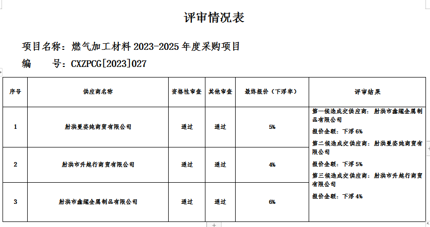 燃?xì)饧庸げ牧?/span>2023-2025年度采購項(xiàng)目按照程序于2023年9月13日10時00分進(jìn)行了競爭談判,采購人通過談判小組推薦的成交候選供應(yīng)商名單確定了成交供應(yīng)商,現(xiàn)將結(jié)果公示如下: