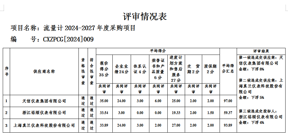 流量計2024-2027年度采購項目 按照程序于2024年4月28日10時00分進行了競爭性磋商,采購人通過磋商小組推薦的成交候供應(yīng)商名單確定成交供應(yīng)商,現(xiàn)將結(jié)果公示如下: