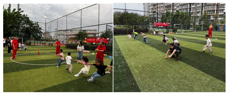 活動現(xiàn)場氣氛熱烈,“穿越呼啦圈”“青蛙跳接力”“吹氣球”“拔河比賽”“齊頭并進”等項目,充分展現(xiàn)親子間的默契和對生活的熱情。初夏的天氣雖然悶熱,但絲毫沒有阻擋活動熱情,趣味十足的游戲活動不僅讓孩子們童趣盡顯,家長們也玩得不亦樂乎,笑得合不攏嘴。