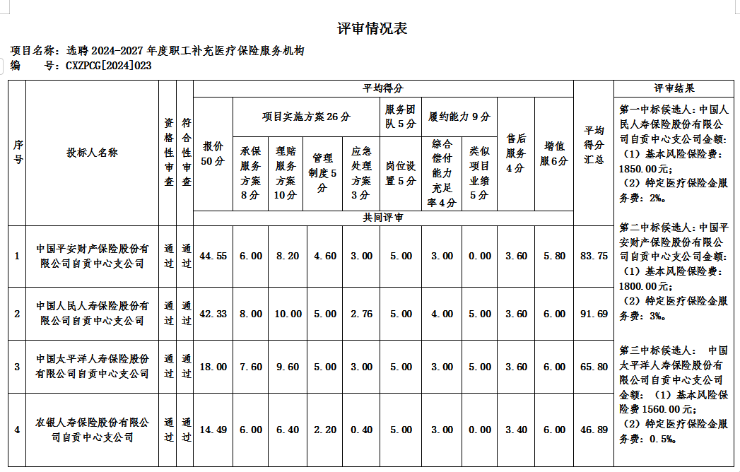 選聘2024-2027年度職工補充醫(yī)療保險服務(wù)機構(gòu) 按照程序于2024年9月19日9時30分進行了公開招標,采購人通過評審小組推薦的中標候選人確定中標人,現(xiàn)將結(jié)果公示如下: