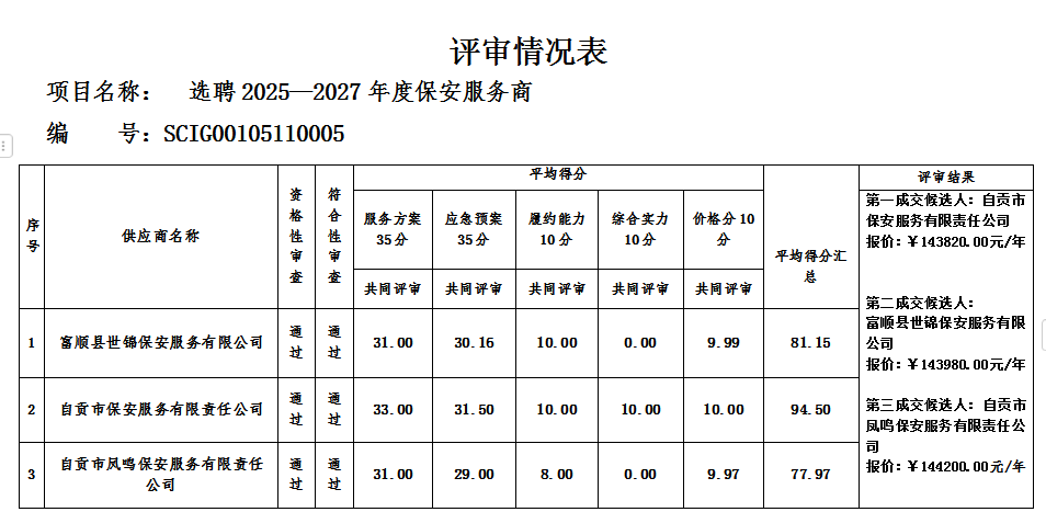 選聘2025—2027年度保安服務(wù)商按照程序于2024年11月11日15時(shí)00分進(jìn)行了競(jìng)爭(zhēng)性磋商,采購(gòu)人通過(guò)評(píng)審小組推薦的成交候選人確定成交供應(yīng)商,現(xiàn)將結(jié)果公示如下: