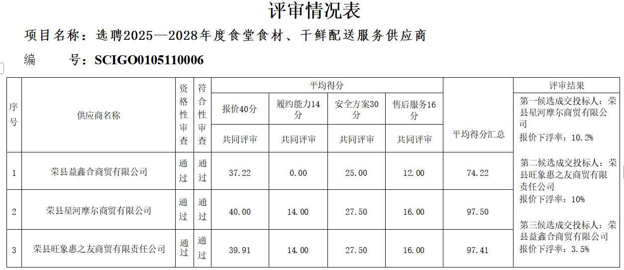 選聘2025—2028年度食堂食材、干鮮配送服務(wù)供應(yīng)商按照程序于20253111000分進行了競爭性磋商,采購人通過評審小組推薦的成交選人確定成交候選供應(yīng)商,現(xiàn)將結(jié)果公示如下: