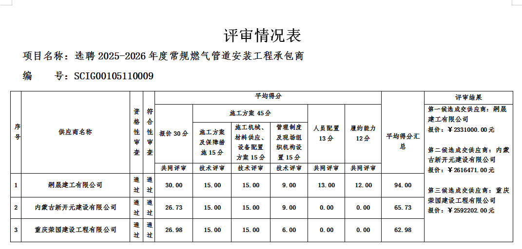 選聘2025-2026年度常規(guī)燃氣管道安裝工程承包商按照程序于2025年5月19日15時00分進行了競爭性磋商,采購人通過評審小組推薦的候選成交供應商,現(xiàn)將結果公示如下: