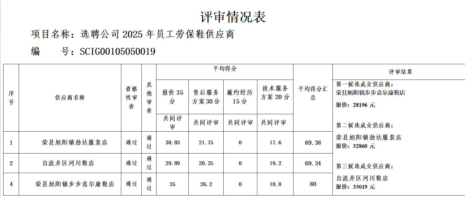 自貢市榮縣川投燃料有限公司選聘公司2025年員工勞保鞋供應(yīng)商按照程序于2025年6月12日10時(shí)00分進(jìn)行了競(jìng)爭(zhēng)性磋商,采購(gòu)人通過(guò)評(píng)審小組推薦的成交候選人,現(xiàn)將結(jié)果公示如下: