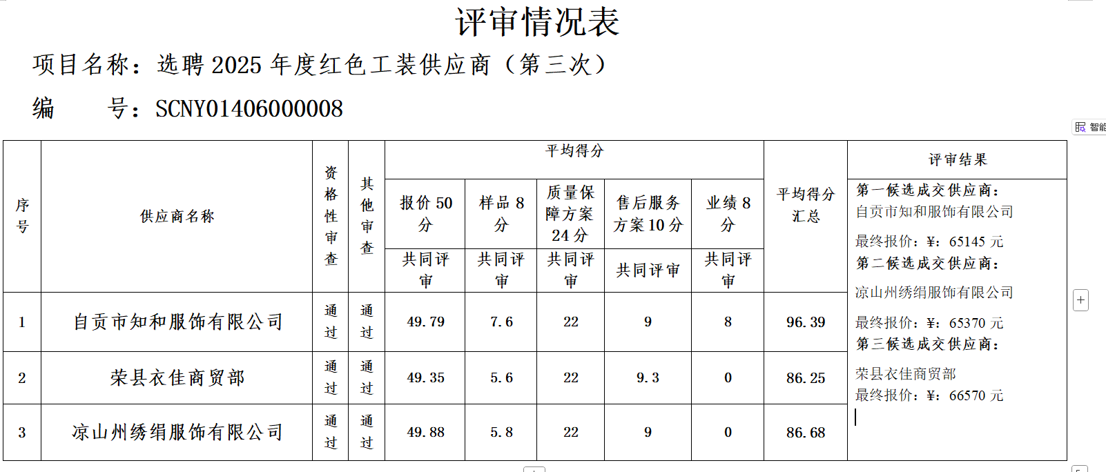 自貢市榮縣川投燃料有限公司選聘2025年度紅色工裝供應(yīng)商(第三次)按照程序于2025年10月14日10時(shí)00分進(jìn)行了競(jìng)爭(zhēng)性磋商,采購人通過評(píng)審小組推薦的成交候選人,現(xiàn)將結(jié)果公示如下: